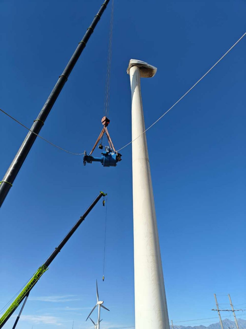 在開展吊裝工作過程中,專項(xiàng)小組時(shí)刻關(guān)注天氣、風(fēng)速變化等情況,充分利用無風(fēng)或小風(fēng)“窗口期”,地面與機(jī)艙作業(yè)人員密切配合,嚴(yán)格把控齒輪箱連接油管、聯(lián)軸器、各傳感器、葉輪與主軸連接螺栓、齒輪箱彈性支撐等各關(guān)鍵環(huán)節(jié)安裝工藝,有效保障更換工作安全有序開展。經(jīng)過連續(xù)奮戰(zhàn),風(fēng)電場掉隊(duì)“成員”終于再次與其他“成員”一起并肩“戰(zhàn)斗”。