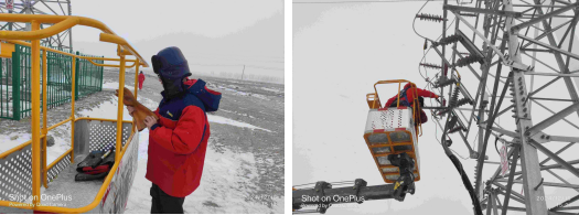 在暴風(fēng)雪期間,風(fēng)電場的應(yīng)急響應(yīng)機制發(fā)揮重要作用。當(dāng)值人員發(fā)現(xiàn)Y2機組報三相電壓不平衡故障時,迅速行動,經(jīng)現(xiàn)場檢查確認(rèn)為隔離刀閘脫落故障。風(fēng)電場立即組織人員準(zhǔn)備工器具,結(jié)合風(fēng)速預(yù)測和現(xiàn)場風(fēng)速變化情況,利用倒風(fēng)向的窗口期進(jìn)行了倒閘操作,并利用登高車對Y2機組隔離開關(guān)進(jìn)行了處理。整個過程,從停送電操作到故障處理,僅用了20分鐘,完美的詮釋了什么叫做“風(fēng)能速度”。