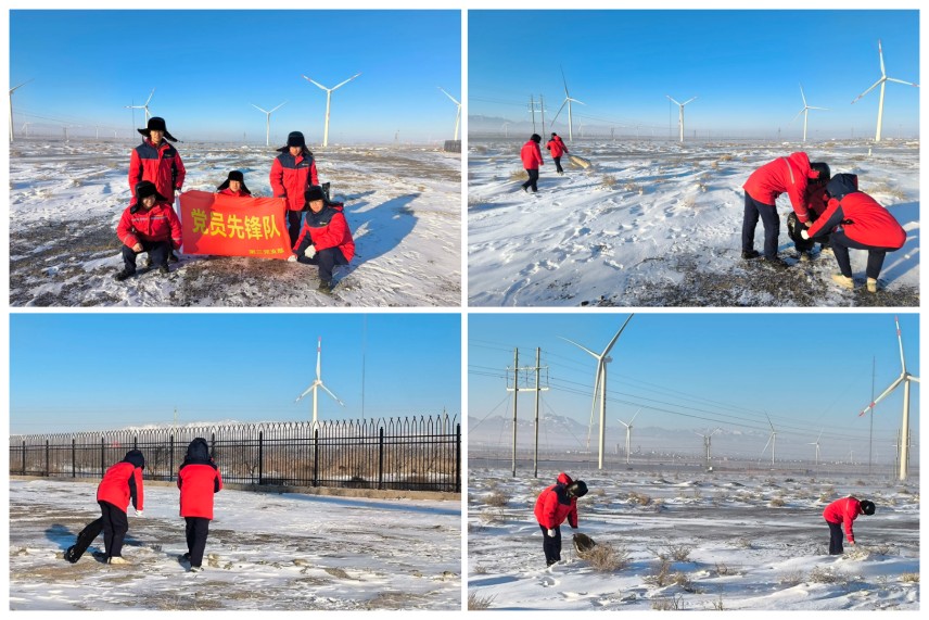同一時間,公司第三黨支部也在達坂城風電場區(qū)域開展志愿勞動活動。大家在完成機組運維工作的間隙,主動拿起工具,清理場站周邊道路及公共區(qū)域的垃圾。大家不畏嚴寒,以高度的責任感和團隊協作精神,迅速投入到垃圾清撿工作中,對角落及設備周邊的垃圾進行細致清理,確保每一處通道都安全暢通,每一臺設備都能正常運行。忙碌的身影在場站中穿梭,與遠處旋轉的風機遙相呼應,共同構成了一幅冬日里充滿溫情與力量的畫卷。